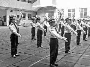 湖南省衡阳市成龙实验学校位于衡阳市城区主干道旁,来往车辆较多。为确保师生出行安全,学校与衡阳市雁峰区交警大队联合创建全市首个“少年交警学校”。在周末和课余时间,这些小交警会在校内校外进行交通安全宣传、道路秩序维持、街道执勤等活动。张成建/摄