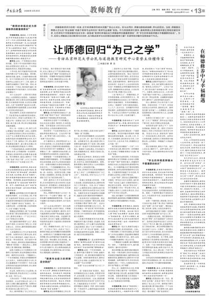 中国教师报:您一直将师德修养视为“为己之学”,强调其应是教师自我完善的内在追求。然而现实中,师德常被外部评价机制工具化,师德培训常被教师视为额外负担,尤其当内容脱离其学段实际或专业需求时。您认为,学校和教育管理者应如何改革师德建设方式,才能真正激发内在动机,让师德修养从“要我做”变成“我要做”?